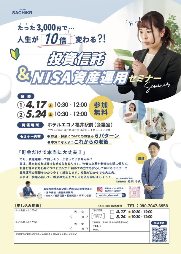 無料セミナー開催のお知らせ「初心者向け!プロが教えるNISA・保険・相続の基礎」2025/04/09お知らせ セミナーお申し込みはこちらから お申し込みフォーム ご相談・お問い合わせ ご相談・お問い合わせ 保険に関する疑問や「ちょっと聞いてみたい」ということがありましたら、ぜひお気軽にご連絡ください。📧お問い合わせ先:コンタクトフォーム📌オンライン相談も受付中!